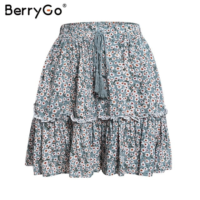 BerryGo print mini women skirts High waist polka dot tassel green A line summer skirt Sexy ruffle beach female tutu skirts 2019
