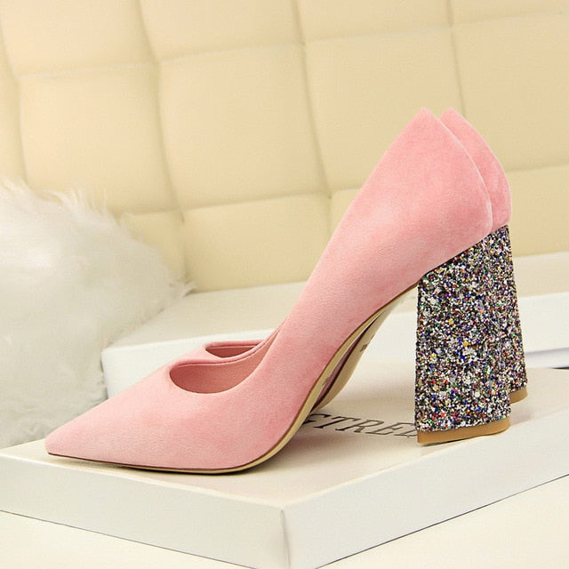 2019 Female 8cm High Glitter Heels Block Pumps Ladies Sexy Chunky Tacones Heels Woman Scarpin Elegant Party Wedding Yellow Shoes